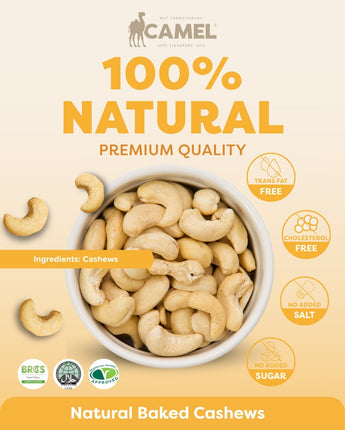Discover the rich creamy taste and satisfying crunch of Camel Nuts Natural Baked Cashew Nuts (1kg), one of our best-selling premium snacks. Expertly oven-baked without oil or additives, these cashews preserve their natural flavor and nutritional benefits. A wholesome source of plant-based protein, fiber, and essential minerals like iron, zinc, and B vitamins, they support heart health and sustained energy. Very low in sodium, naturally trans-fat-free, and cholesterol-free, they are perfect for snacking, meal prepping, or adding to salads, trail mixes, and stir-fries. Learn more about Cashews.
