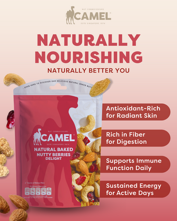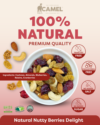 Enjoy the wholesome blend of Camel Nuts Natural Nutty Berries, a mix of roasted cashews, crunchy almonds, juicy mulberries, plump raisins, and tangy cranberries. This Halal-certified, vegetarian-friendly trail mix is packed with protein, fiber, and antioxidants, making it a nutritious option for sustained energy and everyday snacking. Naturally cholesterol-free and trans-fat-free, it’s perfect for on-the-go munching, at work, or as a healthy boost to breakfast bowls and salads. Freshly packed for quality and taste, Camel Nuts Natural Nutty Berries deliver flavor and nourishment in every bite.