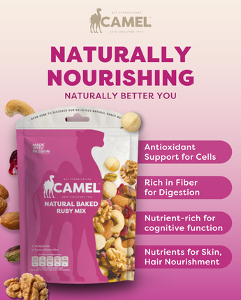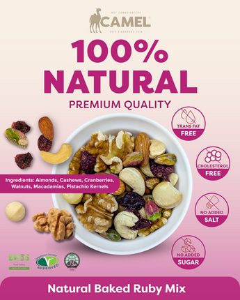 Enhance your snacking with Camel Nuts Natural Baked Ruby Mix, a premium trail mix made from the finest oven baked nuts including almonds, cashews, walnuts, macadamias, and pistachio kernels blended with tangy cranberries for a naturally delicious crunch. With no oil, no additives, and unsalted, this wholesome mix is heart healthy, protein rich, and packed with fiber. Perfect for on the go energy, nutritious meal prepping, or a satisfying post workout boost, it delivers both flavor and nourishment in every bite.