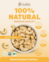 Discover the rich creamy taste and satisfying crunch of Camel Nuts Natural Baked Cashew Nuts (1kg), one of our best-selling premium snacks. Expertly oven-baked without oil or additives, these cashews preserve their natural flavor and nutritional benefits. A wholesome source of plant-based protein, fiber, and essential minerals like iron, zinc, and B vitamins, they support heart health and sustained energy. Very low in sodium, naturally trans-fat-free, and cholesterol-free, they are perfect for snacking, meal prepping, or adding to salads, trail mixes, and stir-fries. Learn more about Cashews.