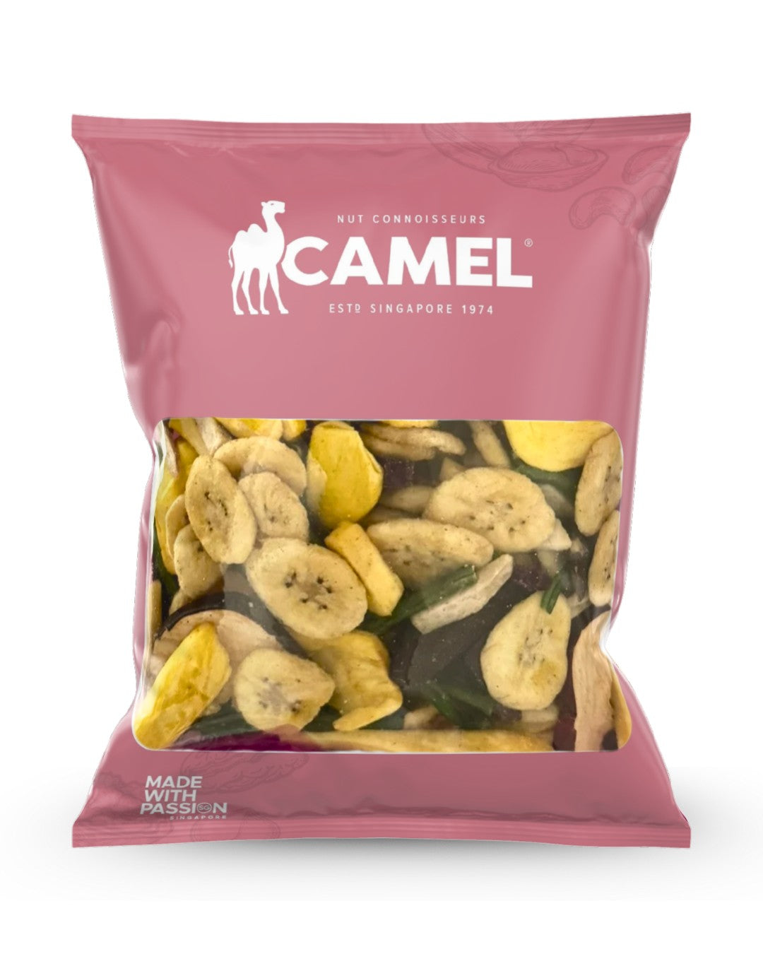 Camel Nuts Mixed Fruit & Vegetable Chips are crafted from a unique blend of wholesome, nutritious ingredients for a snack that’s as delicious as it is nourishing. Packed with a variety of fruits and vegetables—including banana, jackfruit, sweet potato, lady finger, mushrooms, and more—these chips are thinly sliced and perfectly crisped to deliver natural flavor and satisfying crunch in every bite. A healthier alternative to conventional chips, they’re ideal for mindful snacking, sharing, or adding variety to your pantry. Freshly packed for quality and taste, Camel Nuts Mixed Fruit & Vegetable Chips bring color, crunch, and goodness together.