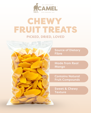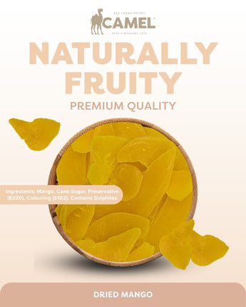 Camel Nuts Dried Mango delivers a tangy-sweet bite in every slice, made from juicy mangoes that are gently dried to preserve their tropical flavor and chewy texture. Packed with fiber and natural fruit goodness, these golden treats are perfect as an on-the-go snack, a school lunchbox favorite, or a delicious topping for desserts and yogurt. Enjoy the taste of mango all year round with the quality and freshness Camel Nuts is known for. Halal-certified and vegetarian-friendly, Camel Nuts Dried Mango is a wholesome choice for the whole family.