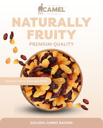 Discover the plump, juicy, and naturally sweet taste of Camel Nuts Golden Jumbo Raisins. These golden gems are carefully dried to preserve their chewy texture and rich flavor, making them a delicious and nutritious addition to your daily diet. Perfect for cereals, yogurt, salads, baked goods, or enjoyed straight from the pack, they provide a natural source of energy to keep you going throughout the day.