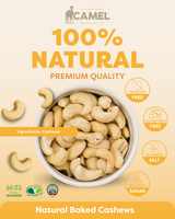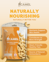 Discover the rich creamy taste and satisfying crunch of Camel Nuts Natural Baked Cashew Nuts, one of our best sellers. Expertly baked without oil or additives, these premium cashews retain their natural flavor and nutritional benefits. A great source of plant based protein, fiber, and essential minerals such as iron, zinc, and B vitamins, they are heart healthy and nourishing. Very low in sodium, trans fat free, and cholesterol free, they are perfect for snacking, meal prepping, and adding to trail mixes, salads, or stir-fries. Learn more about Cashews.
