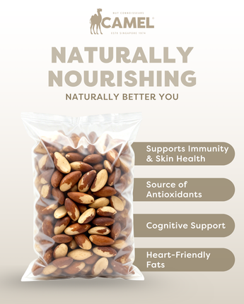Camel Natural Baked Brazil Nuts deliver a rich, creamy taste with a satisfying crunch, making them both indulgent and nutritious. Packed with selenium, healthy fats, protein, and antioxidants, these premium nuts support immunity, energy, and overall wellness. Enjoy them as a wholesome snack, add them to salads or baked goods, or mix them into your favorite dishes for an extra boost of natural goodness. Freshly packed for quality and flavor, Camel Natural Baked Brazil Nuts are pure, delicious, and the perfect choice for a healthy, energizing treat.