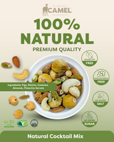 Enjoy a balanced fusion of roasted nuts and sweet dried fruits with Camel Nuts Natural Cocktail Mix. This wholesome blend combines cashews, almonds, and pistachio kernels with juicy raisins and figs for a deliciously satisfying snack. Packed with protein, fiber, and essential nutrients, it is Halal-certified and vegetarian-friendly. Naturally cholesterol-free, trans-fat-free, and low in sodium, it’s perfect for healthy snacking, breakfast bowls, or a post-workout boost any time of the day.