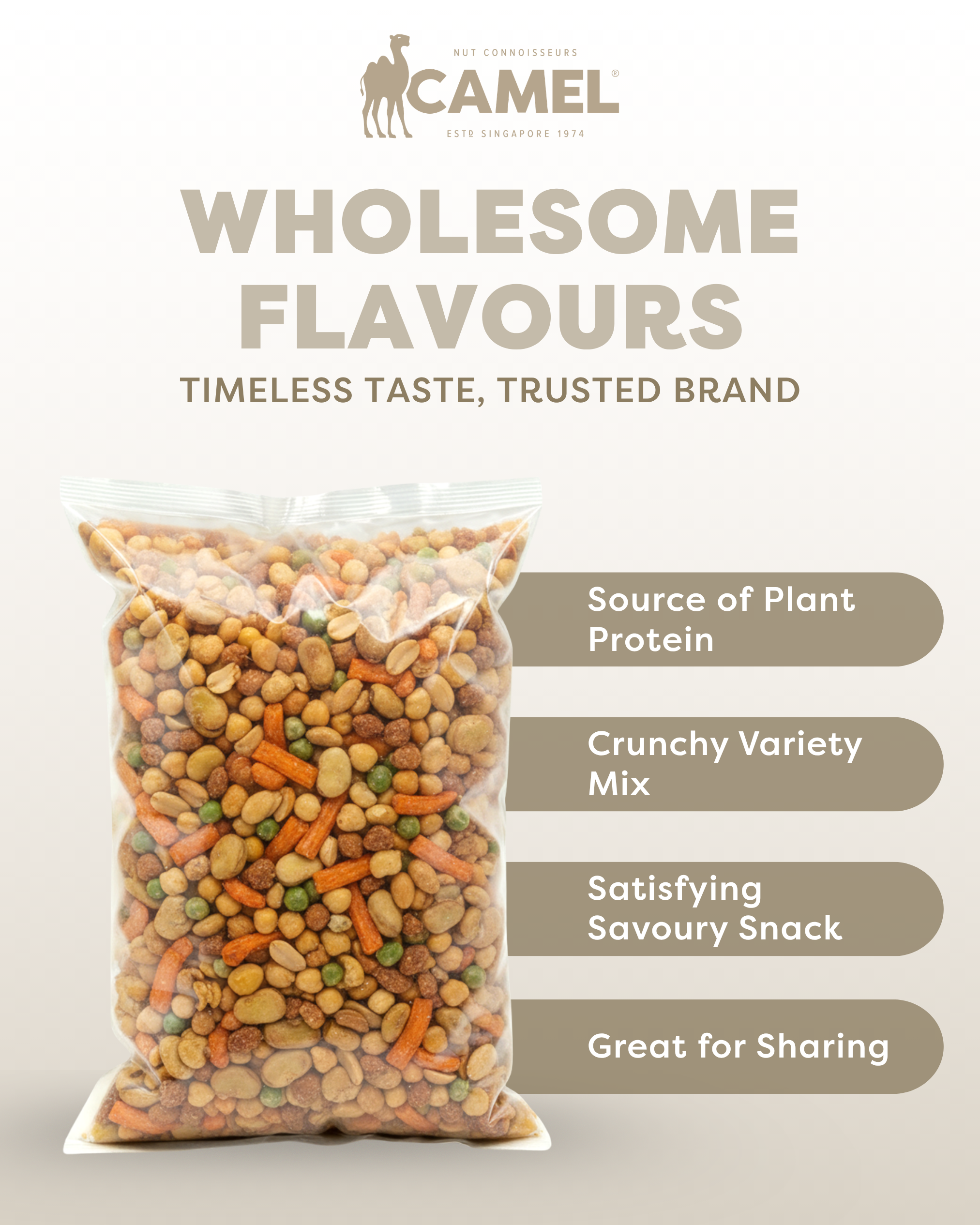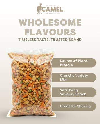 Camel Nuts Mixed Snacks bring together the perfect blend of crunchy, savory, and satisfying flavors in one delicious pack. Featuring premium peanuts, crispy broad beans, green peas, chickpeas, and more, this mix offers variety and texture in every bite. Packed with plant-based protein, fiber, and essential nutrients, it’s a smart way to stay energized throughout the day. Freshly packed for quality and taste, Camel Nuts Mixed Snacks are ideal for on-the-go munching, movie nights, or casual gatherings, delivering wholesome crunch and flavor with every serving.