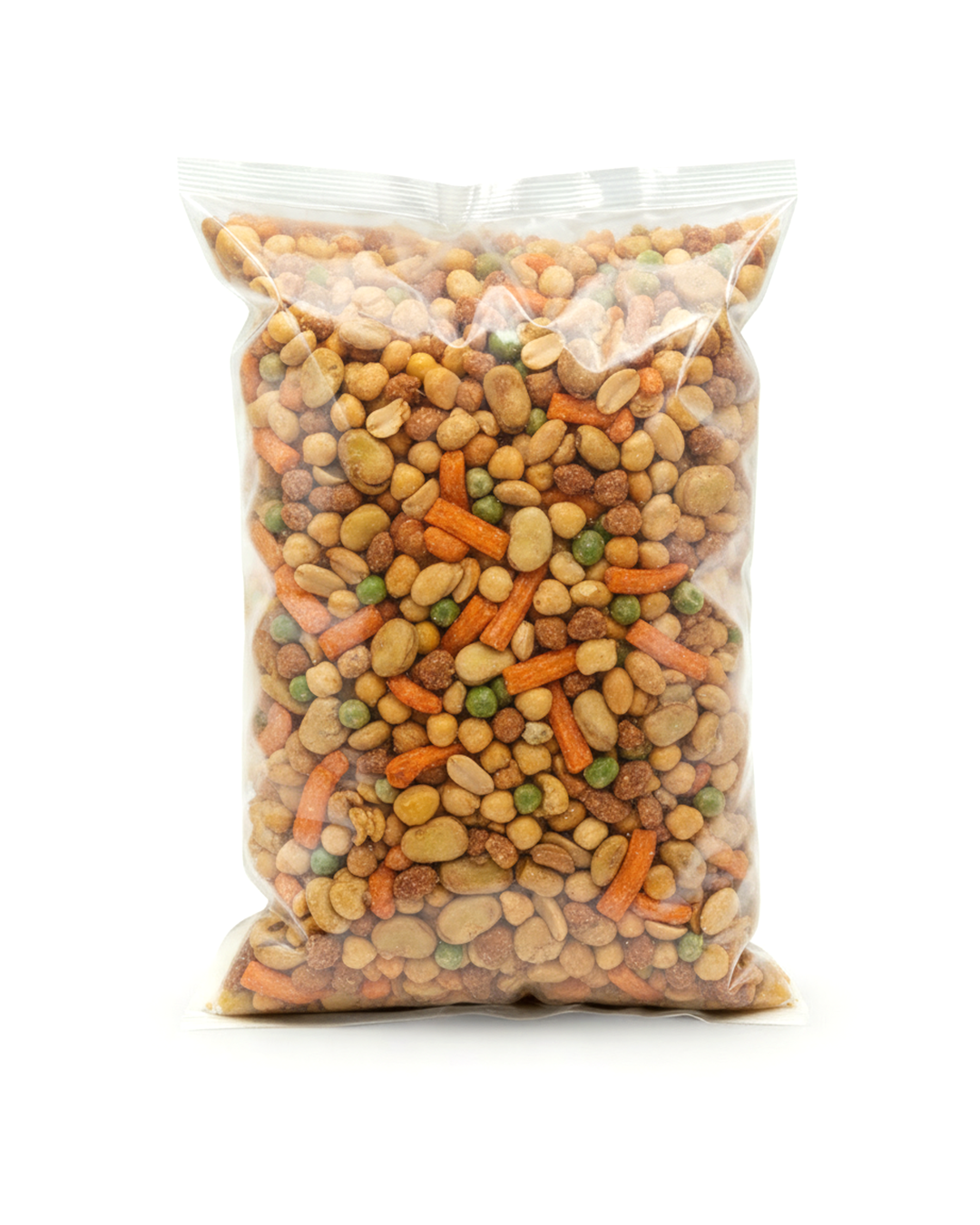 Ingredients: Peanuts, Broad Beans, Green Peas, Chick Peas, Wheat Flour, Corn Starch, Cane Sugar, Palm Oil, Garlic, Salt, Butter, Soya Beans, Prawn Flavor, Yeast Extract, Flavor Enhancer (E627 & E631), Raising Agent (E500ii), Acidity Regulator (E503ii), Colorings (E102, E110, E133)