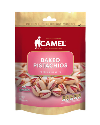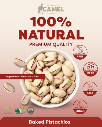 Enjoy the natural goodness of Camel Nuts Baked Pistachios, perfectly baked and lightly salted to enhance their rich, nutty flavor. Packed with protein, fiber, and essential vitamins and minerals, these wholesome nuts make a heart-healthy, nutritious snack. Naturally cholesterol-free, trans fat-free, and low in sodium, they’re Halal-certified and vegetarian-friendly, offering both quality and taste. Ideal for mindful snacking, sharing, or adding to your favorite recipes, Camel Nuts Baked Pistachios deliver crunch and nourishment in every bite. Learn more about Pistachios