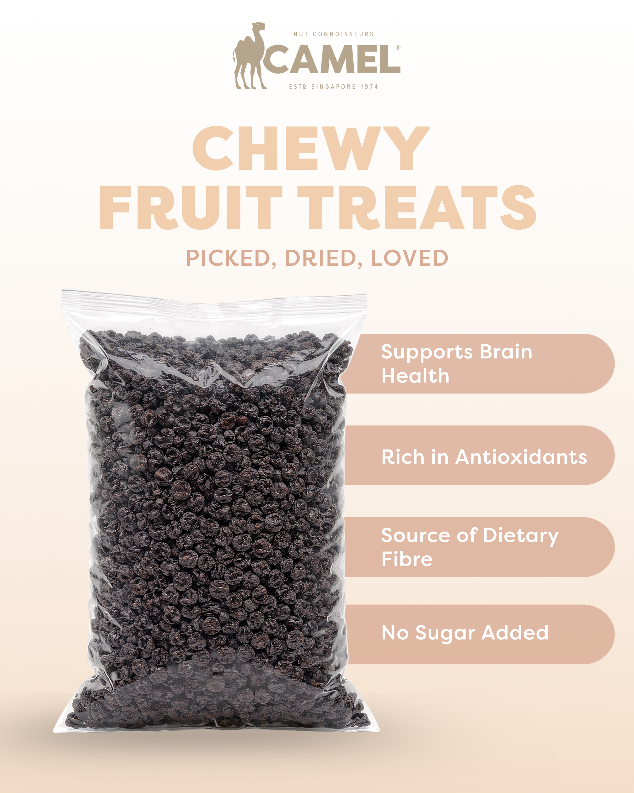 Camel Nuts Natural Dried Blueberries deliver a naturally sweet and tangy berry experience, made with pure dried blueberries and no added sugars or preservatives. Rich in plant-based antioxidants and a good source of fiber, these vibrant berries are perfect for topping breakfast bowls, mixing into baked goods, or enjoying as a wholesome snack on the go. Naturally cholesterol-free and trans fat-free, Camel Nuts Natural Dried Blueberries are a nutritious treat that supports a balanced lifestyle while adding color and flavor to your pantry staples.